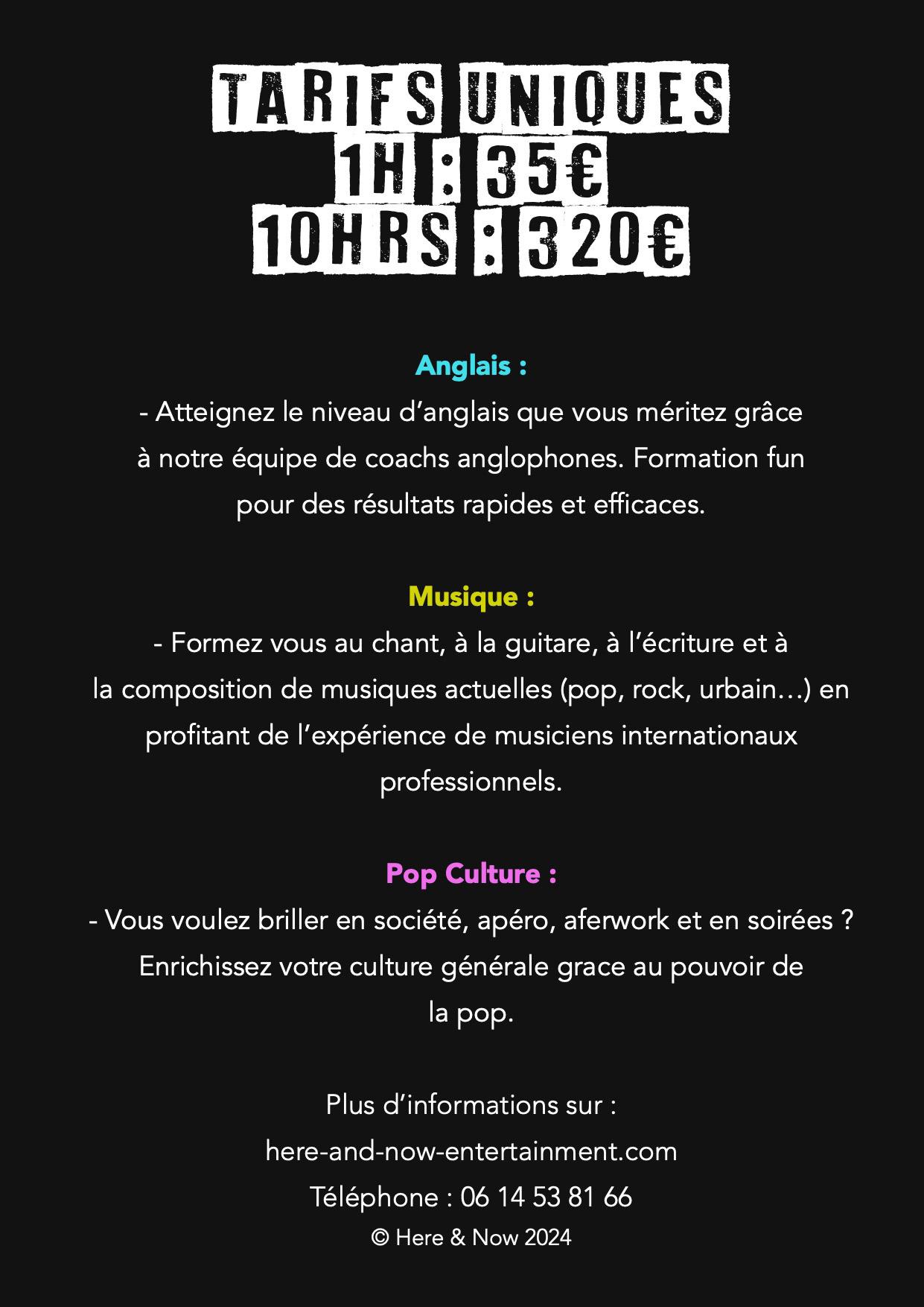 Spécialisés en anglais, musique et histoire de la pop culture, nous nous engageons à libérer votre plein potentiel via une approche adaptée qui saura vous mettre dans les meilleures conditions pour atteindre le niveau que vous méritez. Résultats visibles dès les premiers cours. Learn with fun.